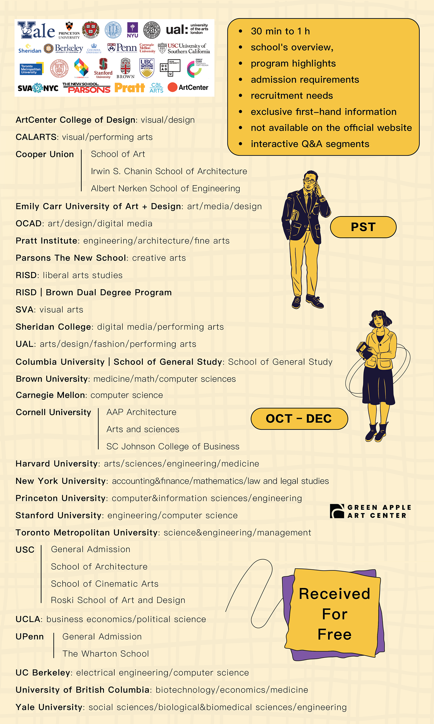 At GAAC (Green Apple Art Center), we've compiled a full schedule and registration info for top university webinars. Simply click the LINK to get access—for free! These webinars are an invaluable tool for making informed decisions about your college journey.