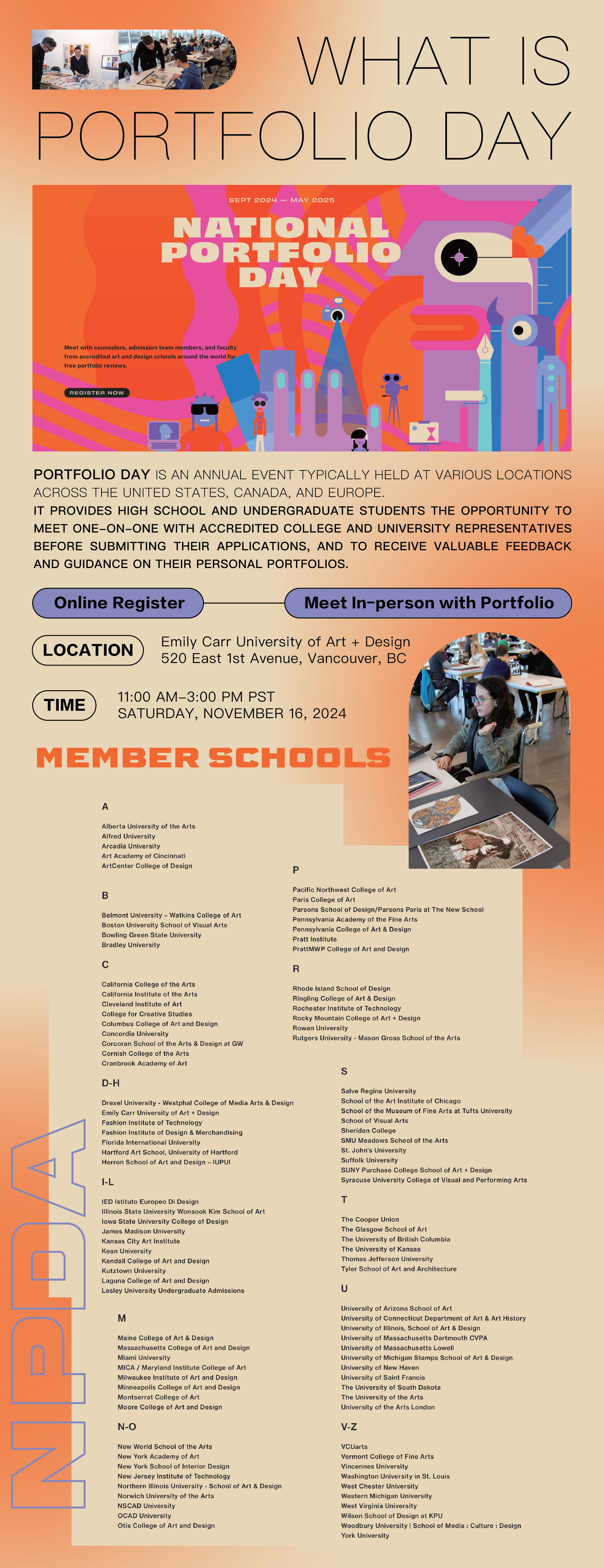 Each Portfolio Day typically features many participating schools, giving students the chance to connect, compare programs, and better understand what each school has to offer.