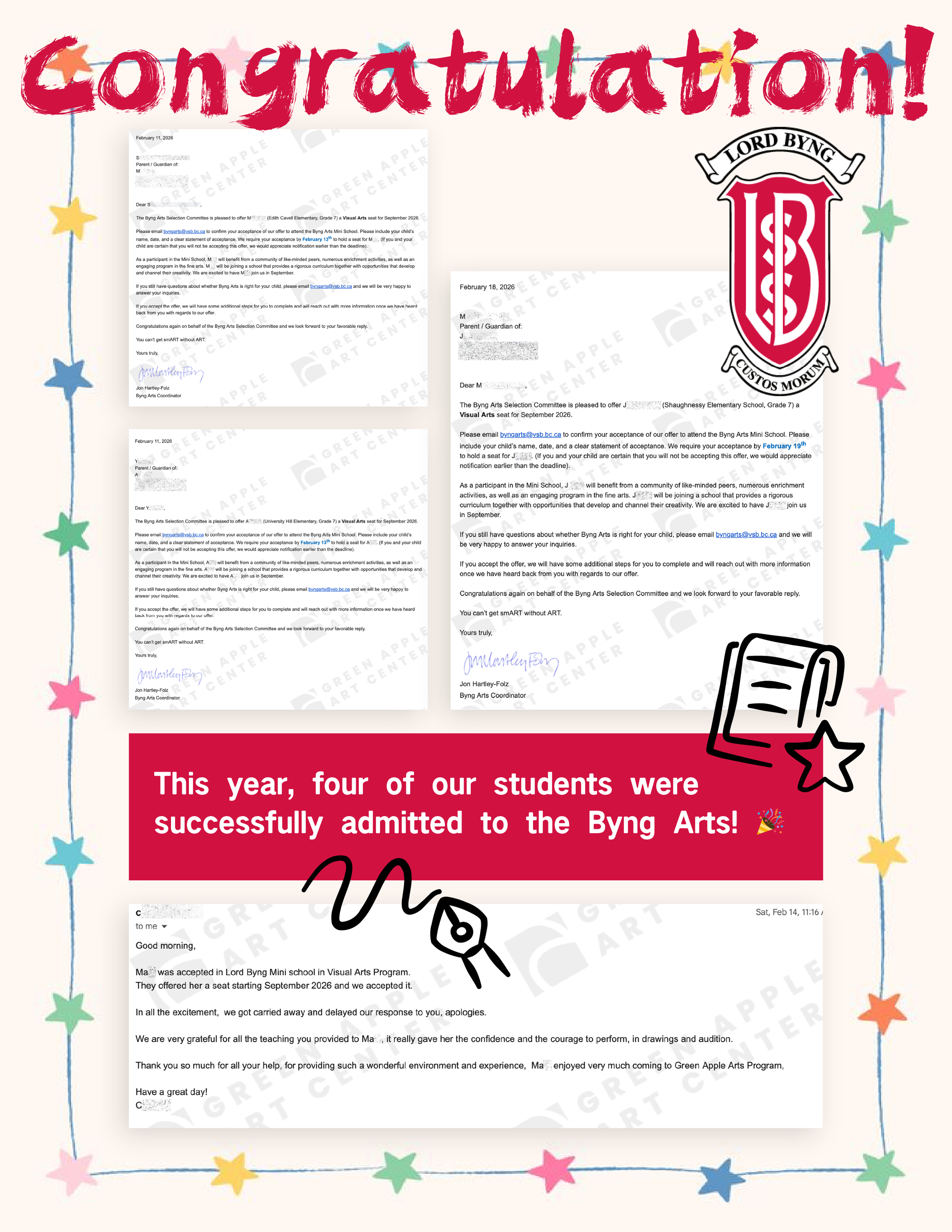 Over the years, GAAC has continuously supported and witnessed students successfully enter Byng Arts, the elite arts mini-school at Lord Byng Secondary. As more students apply each year but available seats remain limited, competition grows increasingly intense. Where there is success, there are also setbacks—but students should not be discouraged.