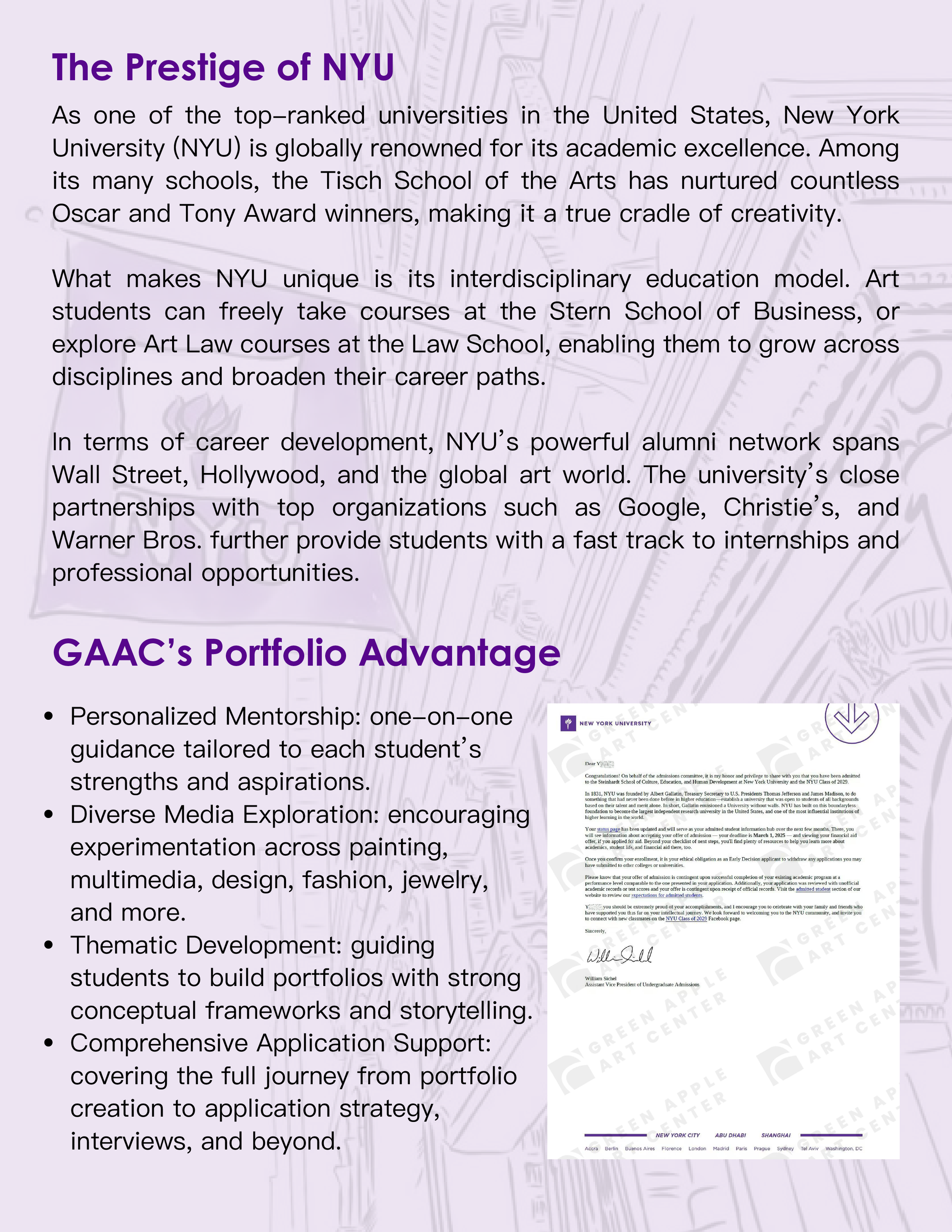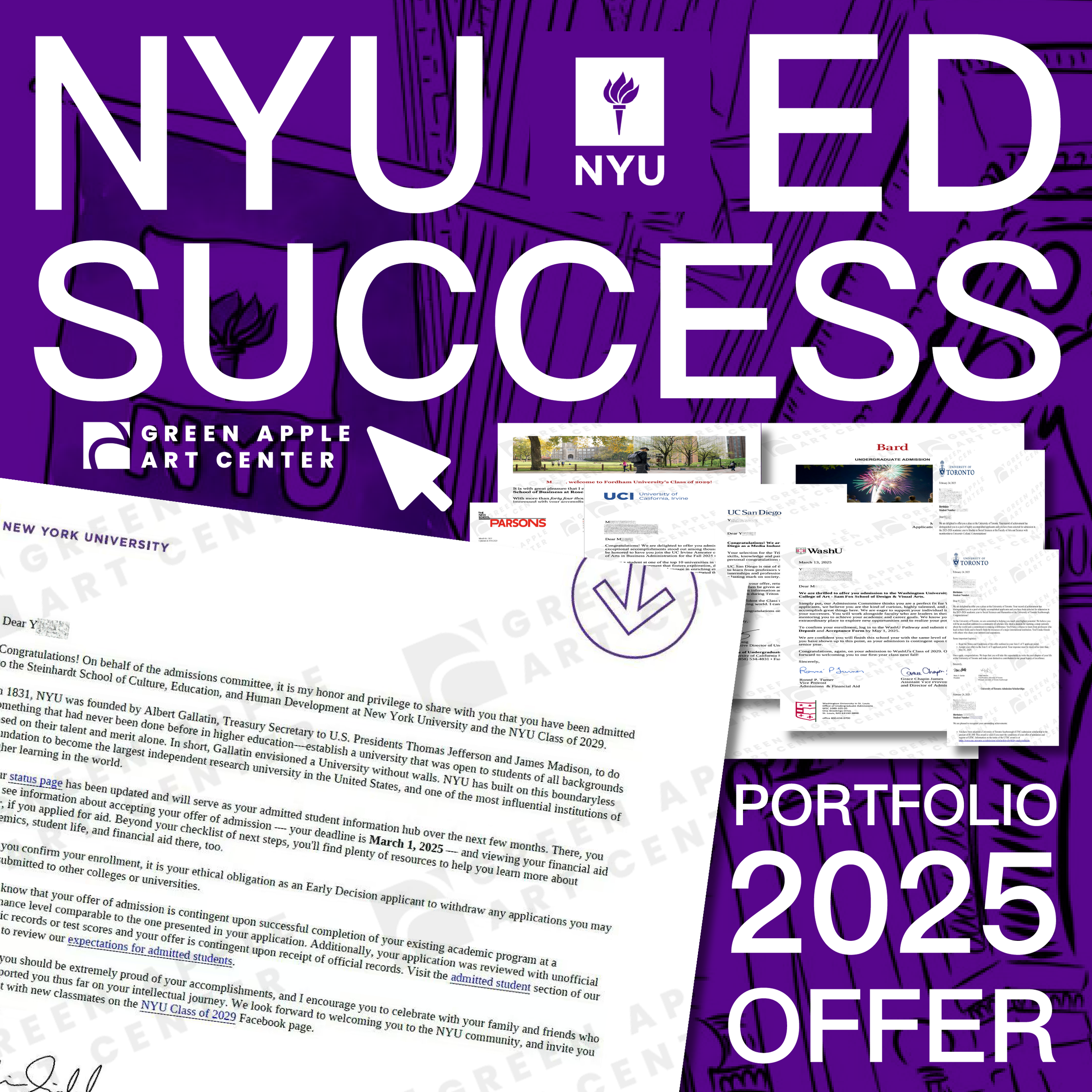 Our outstanding student Macey has been successfully admitted to New York University (NYU) through Early Decision, securing her dream school in the very first round! Even more impressively, the portfolio she created at Green Apple also earned her offers from 10 other prestigious institutions, including top art schools like Parsons and Pratt.